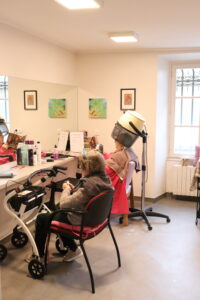 Le salon de coiffure se situe dans le couloir menant à la chapelle à partir de l’accueil.